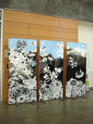We showed off beautiful panels of glass art from artists Manola, Ian Sheldon, and Tammy Henkel with metal sculptural stands by Rogelio Menz which held Manola's glass panel tulips. There was also a couple of more contemporary pieces -- a series of 3 floral panels that encouraged people to interact with by colouring in the flowers + 3 neon coloured tree inspired panels.